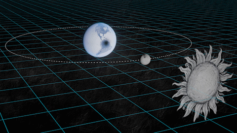 The blue, or teal, lines in this photo represent the plane of the Earth’s orbit in order to demonstrate the angle at which the moon orbits the Earth relative to how the Earth orbits the Sun.